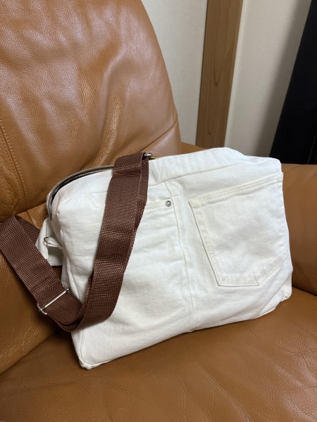 ホワイトデニムのリメイクバッグ。デニムを表にするつもりが、裏の生地が雰囲気良くて途中から路線変更、またまたリバーシブルになりました。