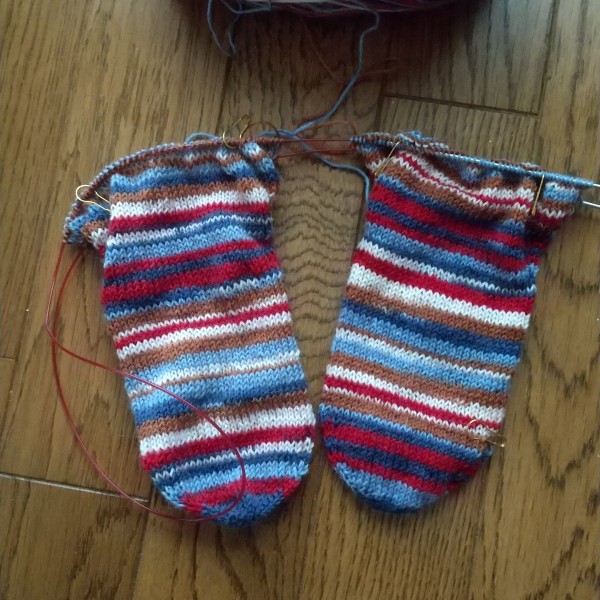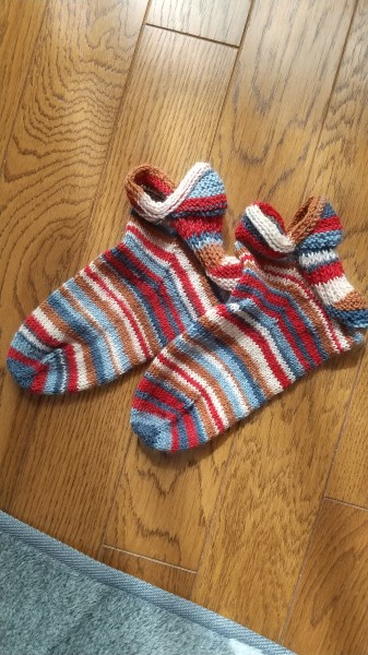 4plyのソックヤーン単色と段染めの2本どり、5号4本針で編む。
