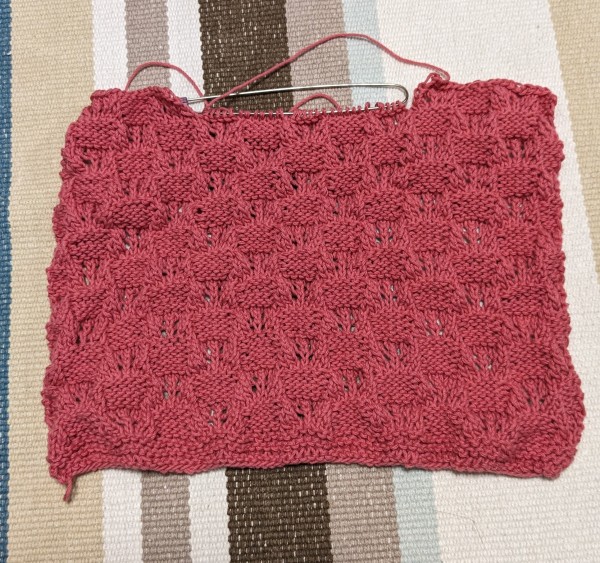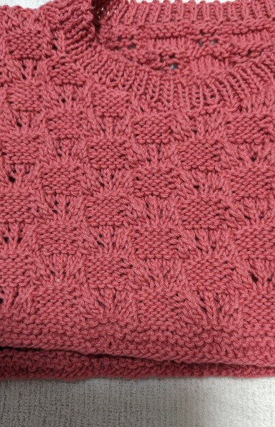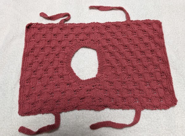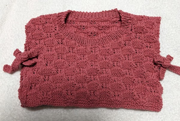 直線編みで、襟ぐりだけ減らして作りました。短い丈で脇は紐で結ぶ形です。