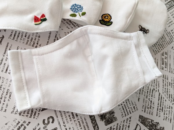 | サラシに刺繍してマスクを作りました。 介護職をしている友人家族に送るので、入所者さんたちの楽しみの1つになればいいなと思って色々な刺繍をさしました。 マスクの裏にはフィルターを交換できるようにポケットになっていて、上部にはワイヤーが入れられるようになっています。 |
