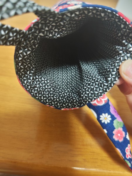 カバンの取っ手に引っ掛けて立てて入れたり、手持ちしたりと様々なので持ち手部分を結ぶことで長さを調整できるようにしました。