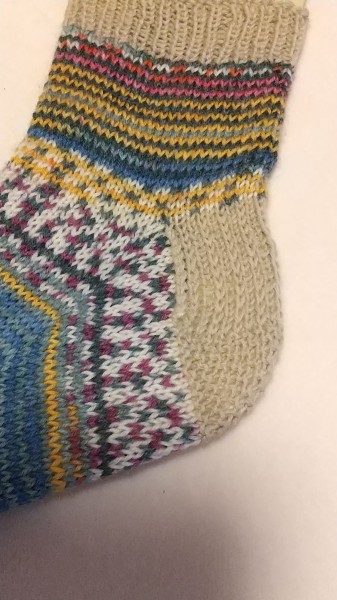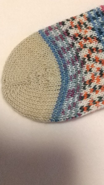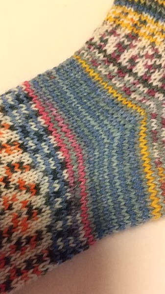 つま先と踵、履き口は単色で、後は段染めソックヤーンのハッピースクラッピー編み(ジョグレスストライプ)で編む手編み靴下。