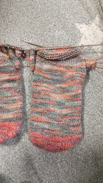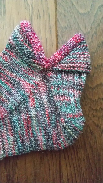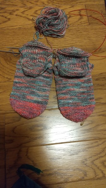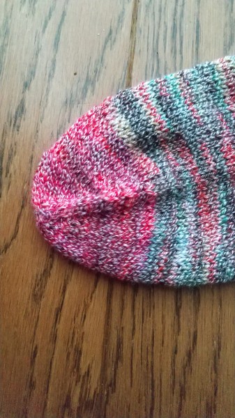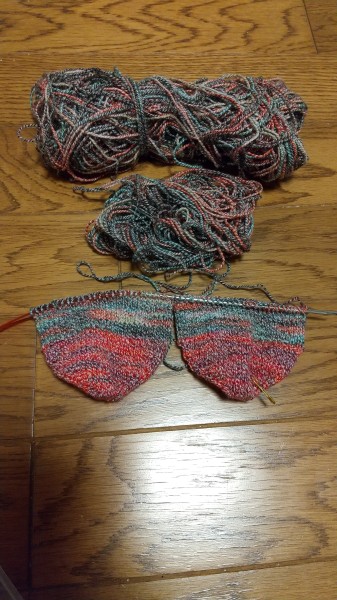 つま先を赤い糸で編み終わり、糸を変えて本体を編み始めたよ。
