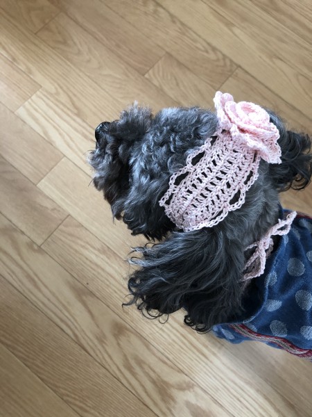 愛犬パールちゃんの可愛らしさを、いかせるように考えて、ピンクのバラを一つ付けて、ヘッドドレスを作りました。