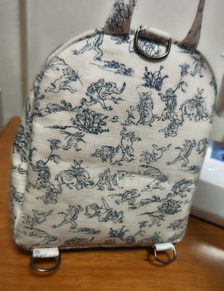 | ミニリュック 身体の小さな祖母の背中に収まるようなリュックをめざして 紐は市販のショルダー紐を背面3点のDカンに通します。上の1点と下左右のどちらか片方の2点を通せばボディバックとしても使えるかな。 |