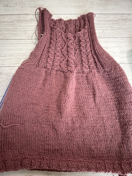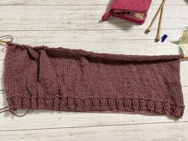 後ろ身ごろはえり開きの線を無視して、上の線まで編んで伏せどめします