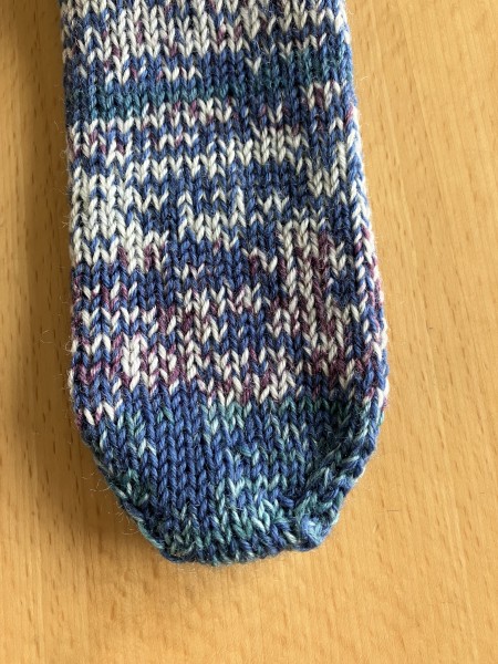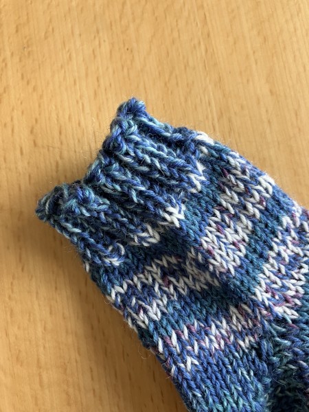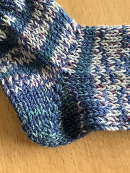 中細糸2本取りの冷え取りソックス(短め) 冷房のきい部屋で履くために編みました 6号針36目で編んでみたら、いつもより細身の靴下に仕上がりました 甲高の私には少しキツイ、、、 足の小さな母にプレゼントします