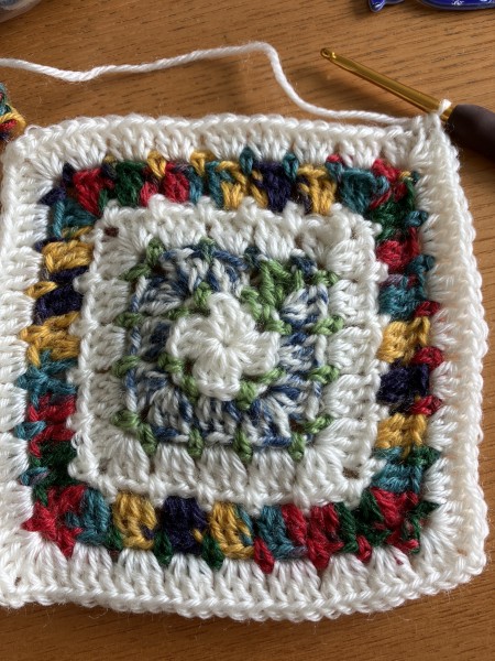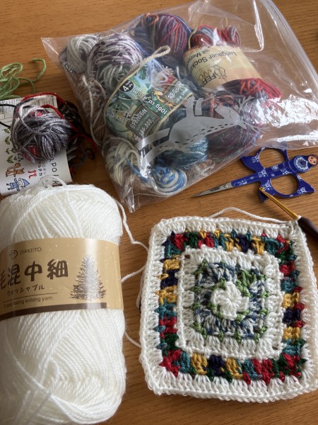 opal、コロポックルマルチカラー、ピエロソックヤーン、カメレオンカメラ、、、ぐるぐるぐるぐる編みつないで、ここまで成長