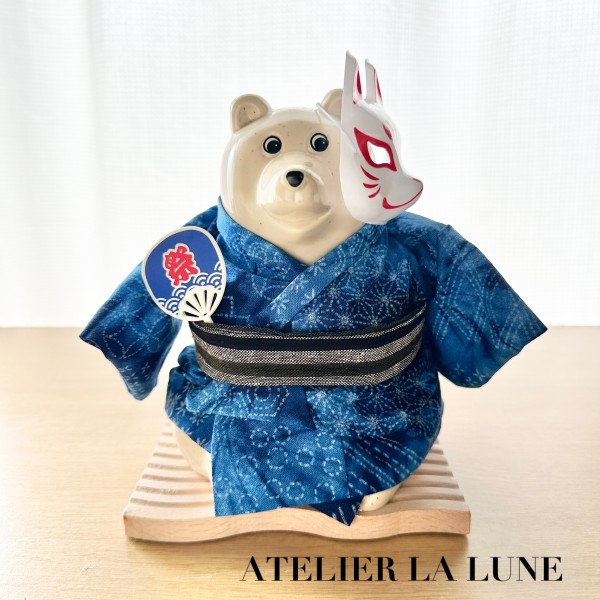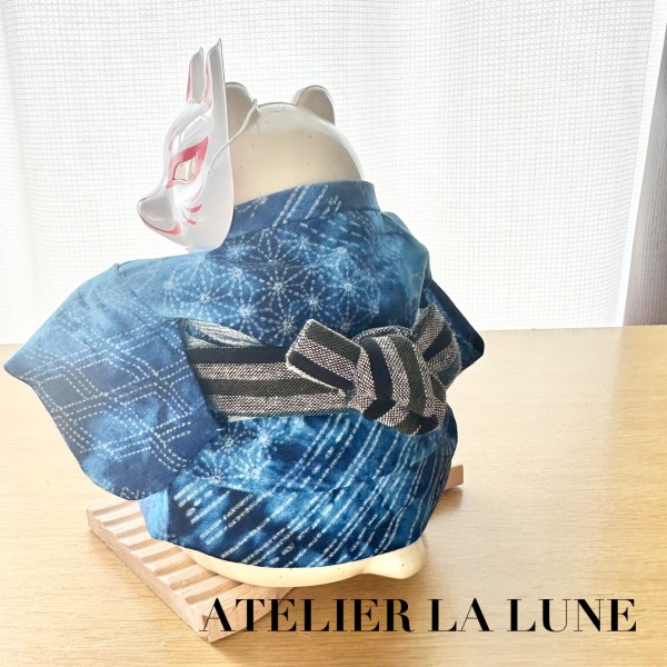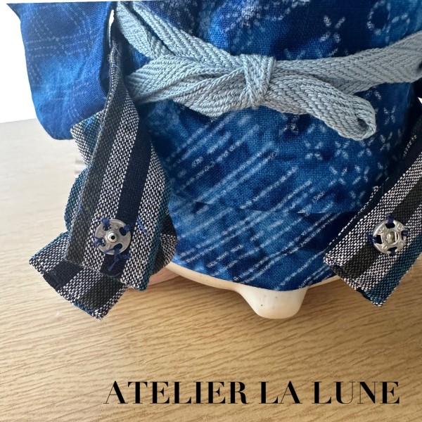 しろくま貯金箱の着せ替え服で、男の子の浴衣を作りました。帯はホックをつけて、ワンタッチで留められるようにしてあります。