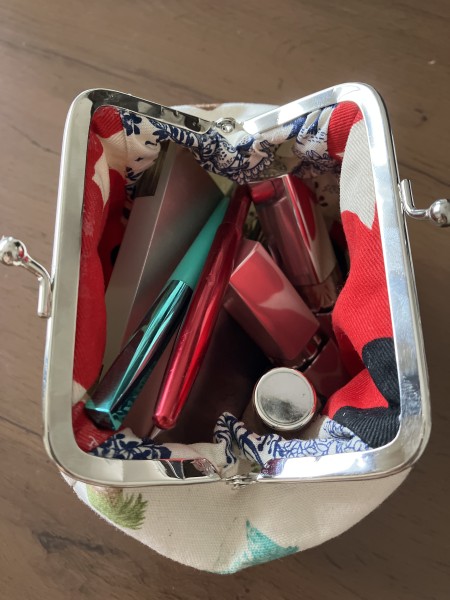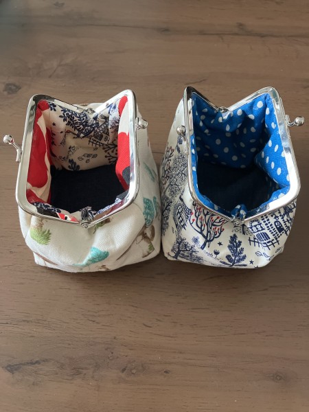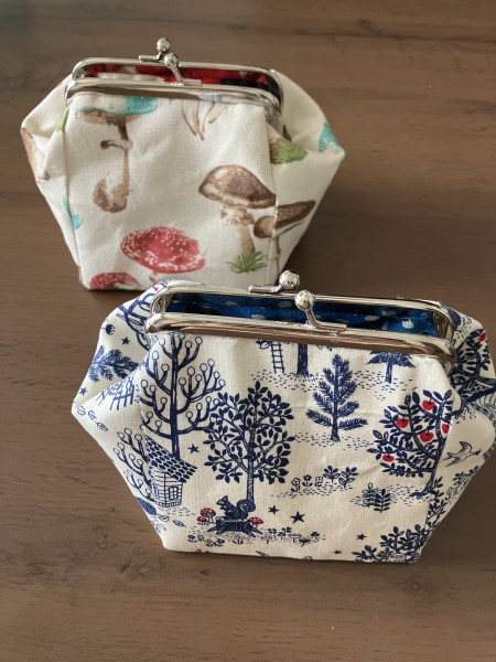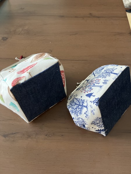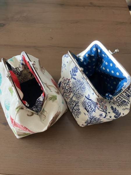 正方形の布を5枚合わせて100均のがま口で作成しました。底はデニム生地で小さいけどたっぷり入りました。