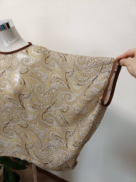 | 要藤商店さんでポリエステル1.6m購入 ミセスのスタイルブック2019盛夏号より 透け感のある生地で 最初はオーバーワンピのつもりで購入したら生地幅間違えてて 笑 オーバーブラウスなら足りるかな?と変更して作成。 中にタンクトップかキャミは必須かなー。 本では共布でバイアス取ってたけどちょっと無理なんで同系統の色のバイアステープで袖ぐり襟ぐりを処理。 |