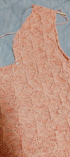 後ろ身頃が出来あがったので前身頃を編んでます。