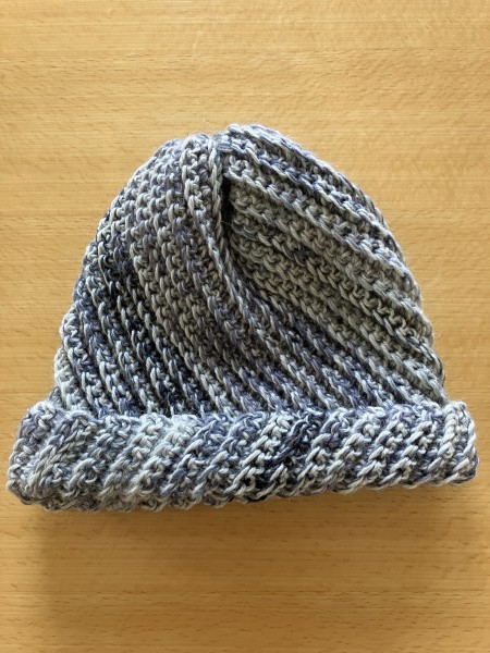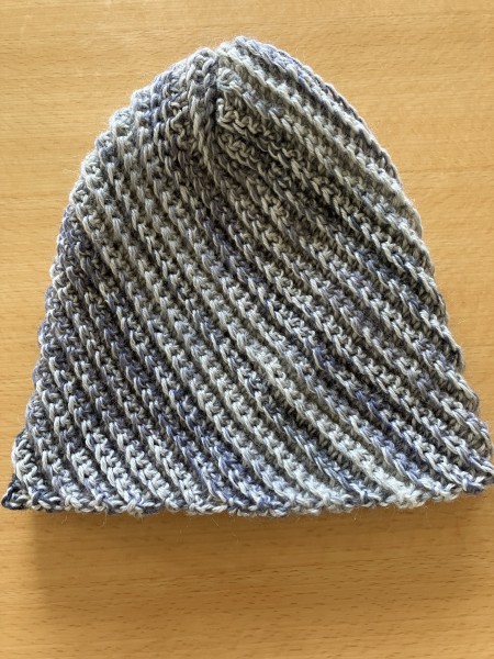 グレー系の糸を2本引き揃えて斜め模様の帽子を編みました
