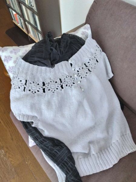 糸を切らないモチーフ編みを襟にしてメリヤス編みで編み下げました。