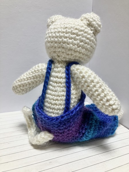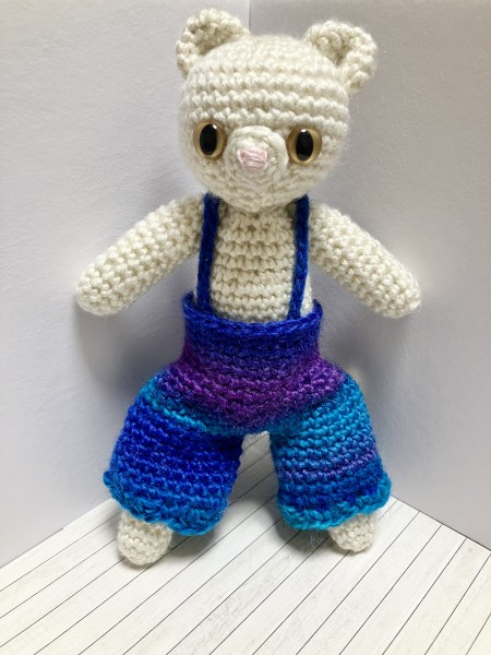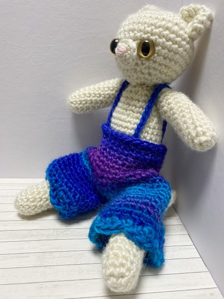 ズボンを履いた白猫の男の子の編みぐるみです。おすわりができるように足の付け方を工夫しました。グラデーションの毛糸を編むのが楽しかったです^ ^