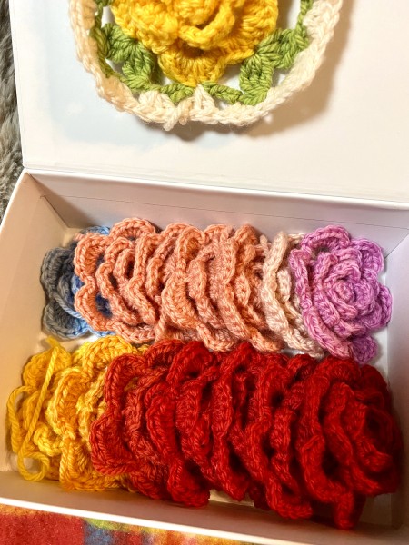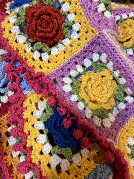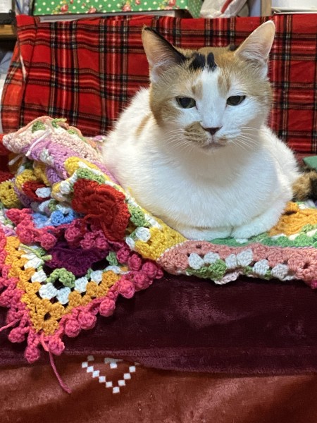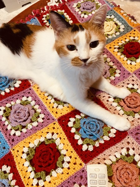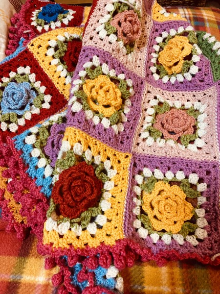 | 寒くなってきたのでお花モチーフ編みのブランケット。お花がいっぱいの明るい色で気分もウキウキ。縁編みはマゼンタピンクで。 やっとこ完成です。 |