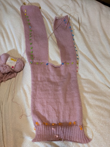 後ろ身頃裾のゴム編みを編んで長さを決めないと、前身頃の長さが決まらないため、あちこち編みかけになってます