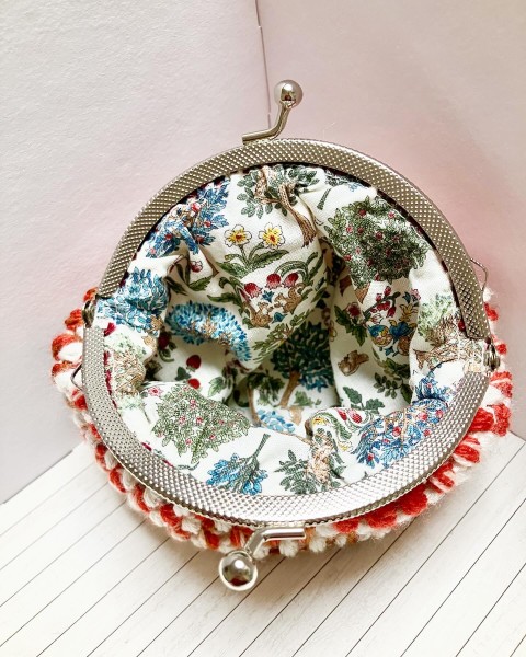 パフステッチのがま口ポーチです。グラデーションの糸のランダムの色合いで編むのが楽しかったです。内袋は森の動物柄です。