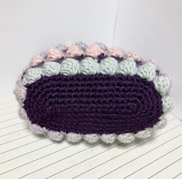 ぽこぽこしたパフコーン編みのポーチを作りました。グラデーションの毛糸で編むと、色の変化が楽しめて面白いです。中袋は森の動物柄です。