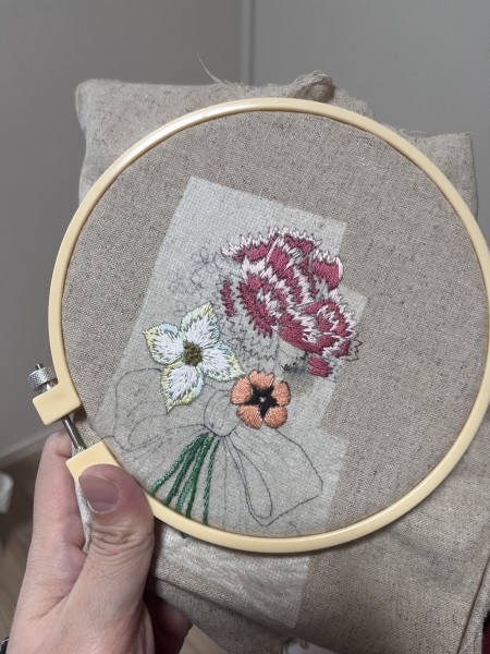 | とりあえず刺繍。 いづれ何かに仕立てるけどどうしよう…。 とにかく花束の刺繍がしたいのでやります。 |