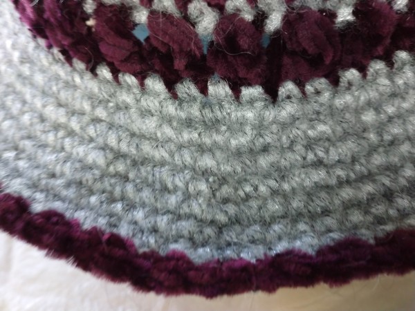 | リボンヤーンにモヘアを絡んだ光沢のある、珍しいファンシーヤーンをいただきました♪ 帽子を作ろうと考え、これまた!何を作ろうかと考えていたダーク系のワインカラーのモールヤーンを配色に長編交差編みをして、おしゃれなハットが出来上がりました♪ |