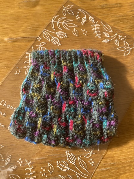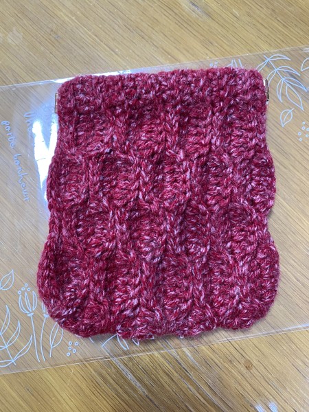 | アーモンド柄のバネ口ポーチ 糸の太さ、大きさ、柄の出方を試行錯誤しながら編みました。 |