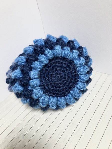 パフコーン編みのがま口ポーチです。中袋の縁にあえてタックを入れました。