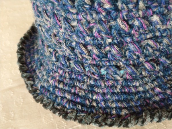 | 中細系の毛糸数本、カールヤーン数本、ブルー、紺、グレー、ピンクの6色を混ぜ合わせ、帽子編んでみました♪ 色を混ぜ合わせる事により、色調に深みを出してます。 縁編みは極太モールヤーンのため、全体のバランスを考え、バックこま編みと鎖編みで仕上げてみました♪ |