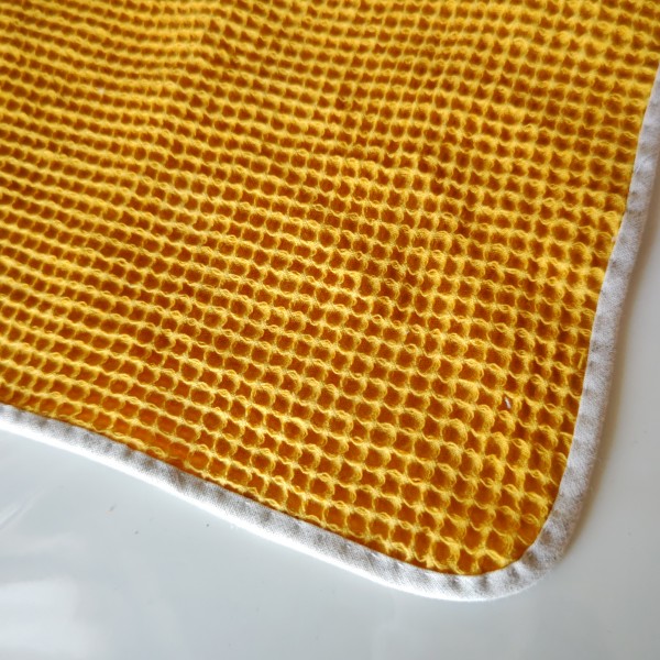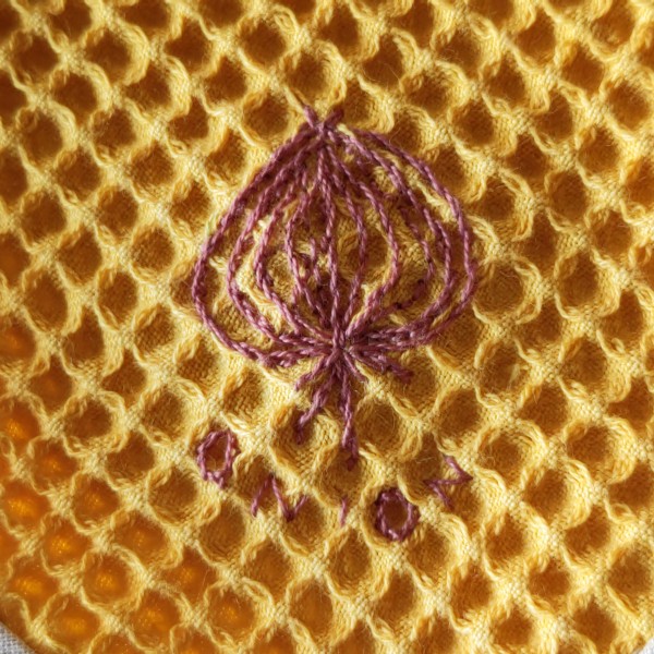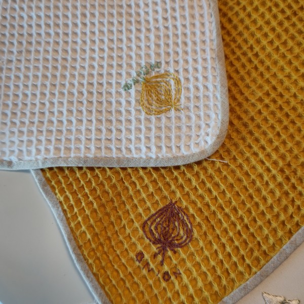玉ねぎの皮で布と刺繍糸を染めました。明るい黄色が元気をくれます。ワッフル生地を染め周りをリネンのバイヤステープでくるんでます。白いままのほうには、染めた糸で玉ねぎ刺繍しました。
