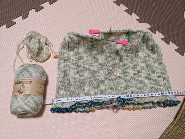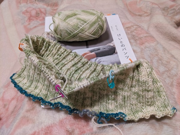 ウエスト部分最後の1段。ちょうど3玉目が終わりそう。同じ毛糸は在庫が足りない(あと1玉しかない)ので、足の部分(裾)は違う糸で編むつもり。ゲージ取り直すかゴリ押しで行くか悩み中。笑