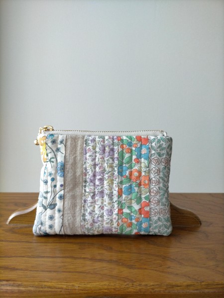 リバティの細長い生地を合わせてキルト生地に仕立てて作ったファスナーポーチです。仕立て方法はyasuminさんの方法を参考にいたしました。