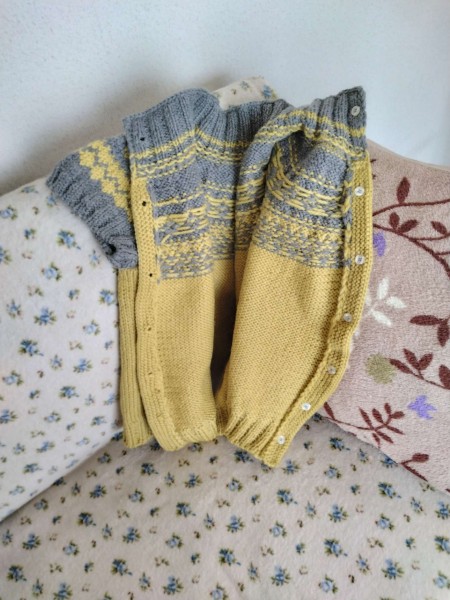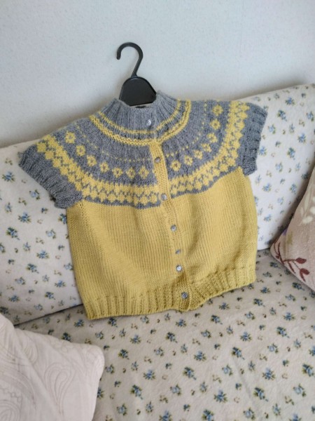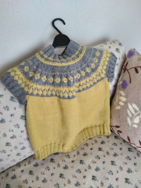 長袖にして袖口にも編み込みを入れる予定でしたが、糸が入手できなくなり、ベストにしました。残念です(ノД`)シクシク