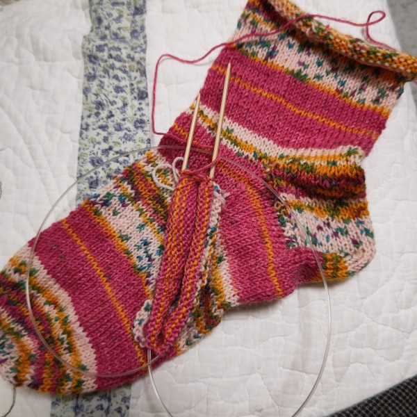 梅村マルティナさん著を参考に、かかとのある 靴下を輪針で編みました。動画でイメトレして、本を頼りに、かかと部分を攻略。私には動画も本も両方あったほうが良さそうです。細い針は、なかなか進みませんが履き心地よい糸で快適です。柄合わせは、あえてしてません。