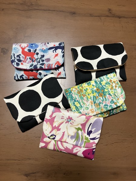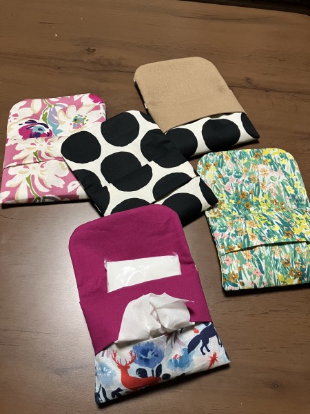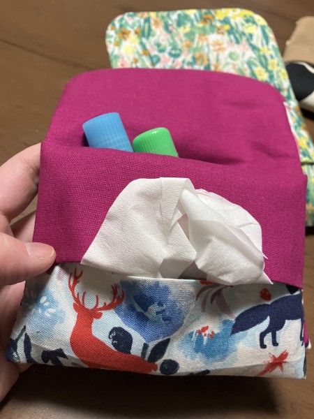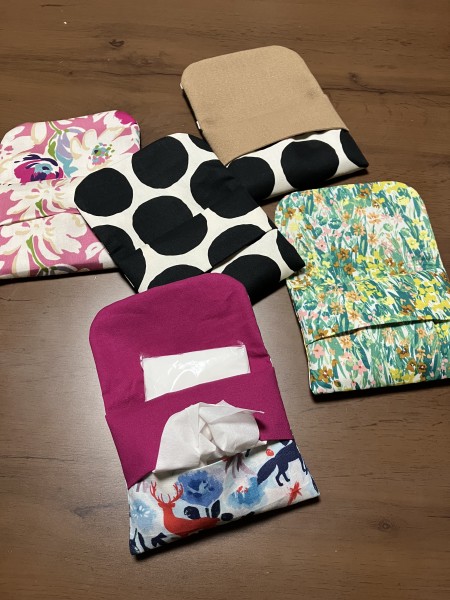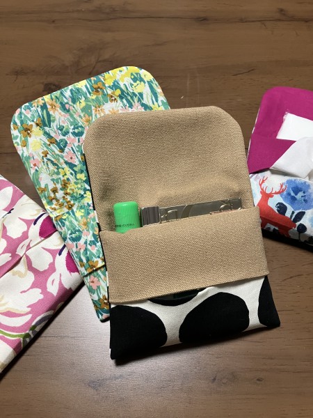 ポケットティッシュポーチ作成。花粉のシーズンには持ち歩きたいティッシュ、目薬やお薬などの小物も一緒に入ります。