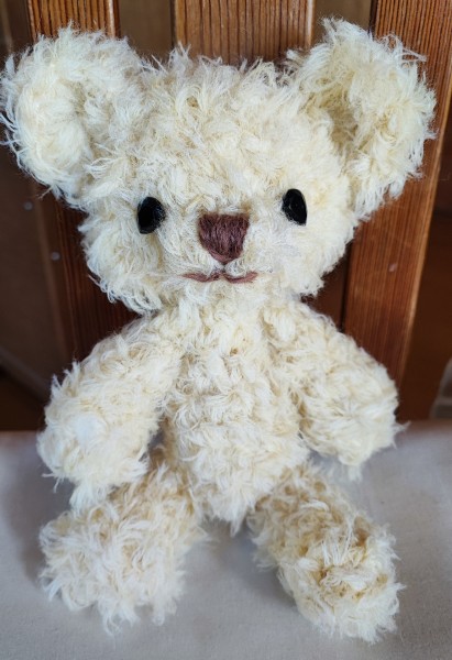 | あみぐるみのくまちゃん。 身長約24cm。 毛足が長く優しいお顔の子です。癒されます。 2024年12月15日に編み始め。糸が足りなくなり足と鼻が編めず。買い足しに行き、糸を確保したらそのまま放置。完成にこぎつけました。 SeriaのリトルバニーとDAISOの細いモヘアの2本どり。 |