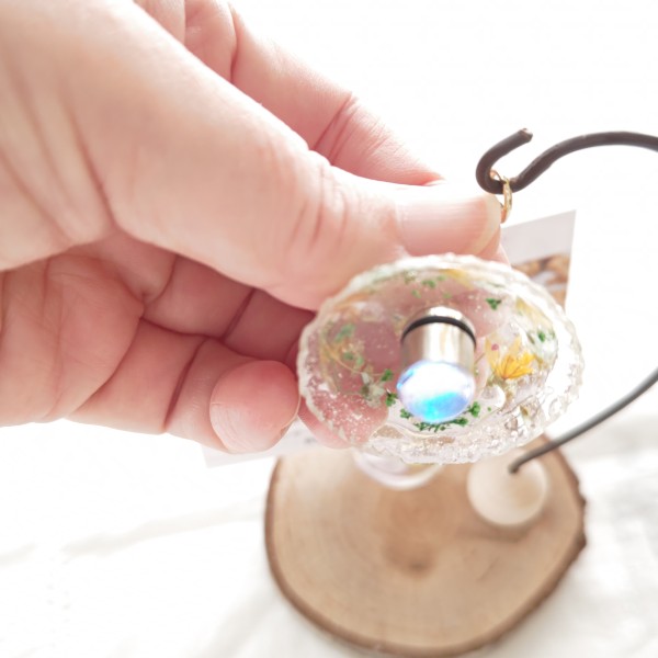 小さなライト。本物の花とレジンでできていて、実際に点灯。電池交換もできます。ずっと卓上に飾れるものを考え続けてきました。やっと形になってきました。