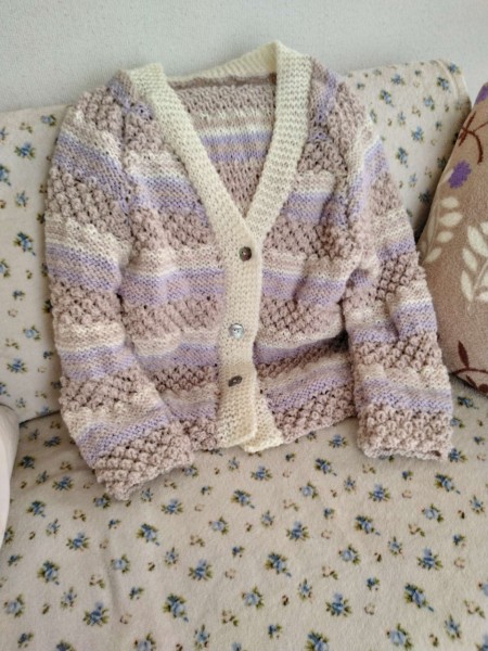 | ゲージを合わせるため、並太糸を8ミリジャンボ針で編んだので、フワンフワンの出来上がりです。模様編みとメリヤスのゲージが違うため増やし目減らし目を繰り返し、しかもラグランスリーブなので複雑でとても楽しかったです。 三國万里子さんの「冬の日の編みもの」を参考にさせていただきました。 |
