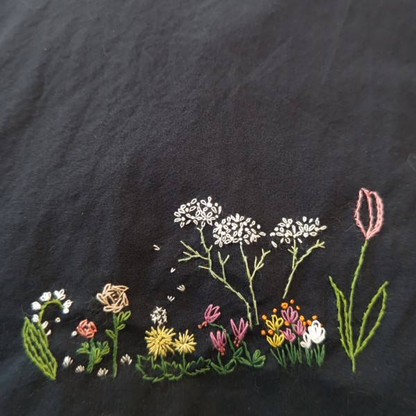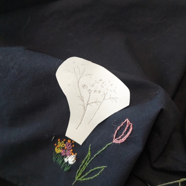 ラフスケッチしたノートを見ながら、春の花を、フリーハンドで指にお任せして刺繍しました。