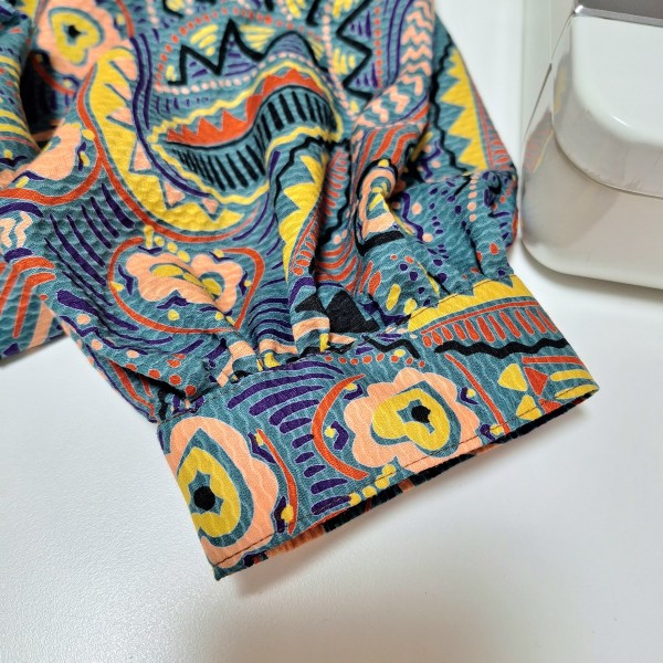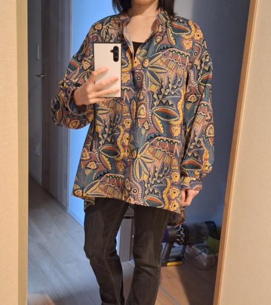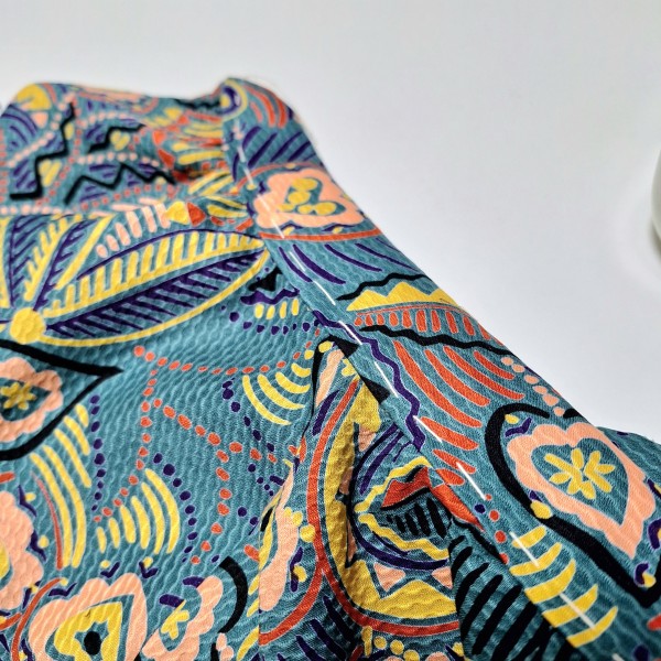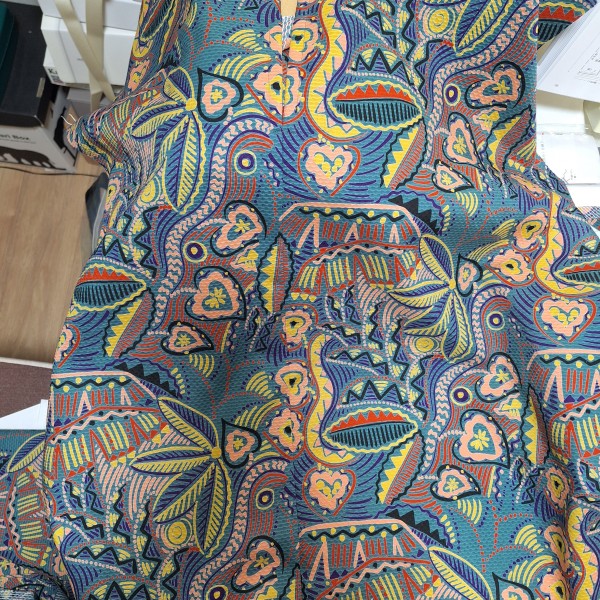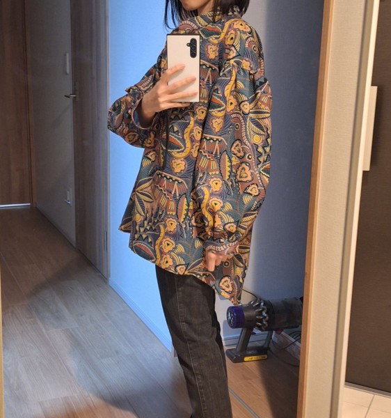 80番手のローンです。生地だけ見ると派手ですが、体に当てると意外にもそれ程派手に見えない不思議な生地です。