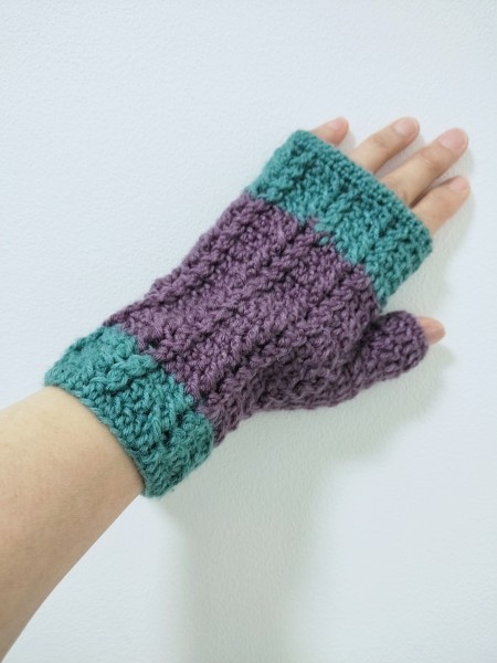 余り毛糸でハンドウォーマーを3種類編みました。余り毛糸なので色の組み合わせが難しかったです。ギリギリの毛糸もあったので完成して良かったです。