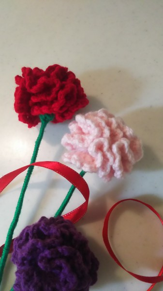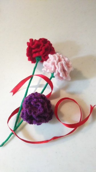 アクリル毛糸でカーネーションを編んでみましたぁ~萼と花柄部分はワイヤー入りですぅ