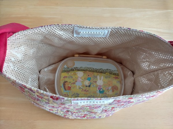 娘の弁当箱と水筒が入るサイズを考えて作りました。