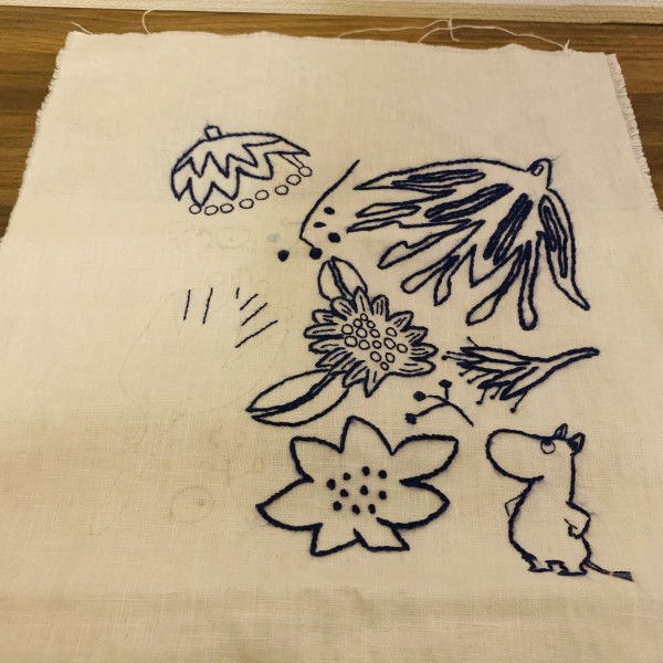 「MOOMINボタニカル刺繍」から。中断しつつ、やっと完成しました!内布は、ミモザの柄に。