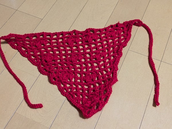 ダンスの衣装で赤のバブーシュカが欲しくて、YouTubeを参考に自分サイズで編みました