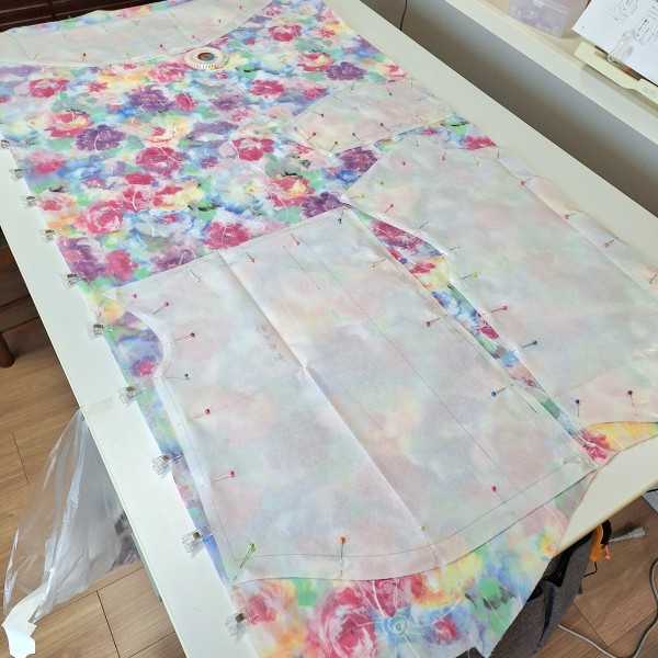 前身頃、後身頃共に「わ」で裁断するレシピだったのですが、前回の薄手シャツの残り生地120cmで作るために、後見頃を中央で合わせることにしました。