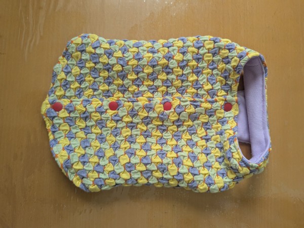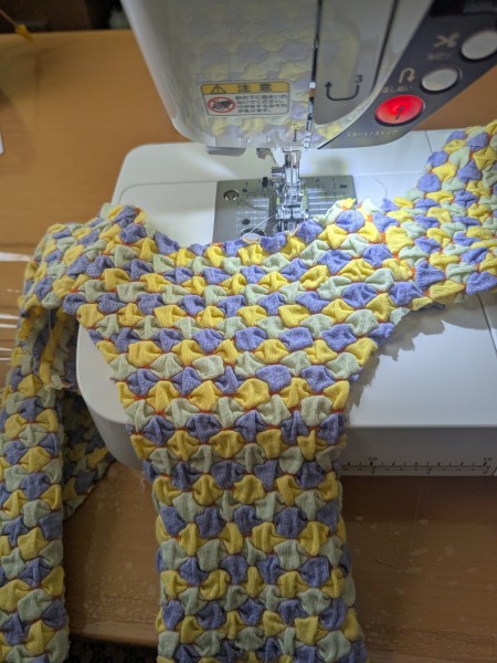 ラベンダー色の裏地にする生地が近くのお店にも無くて、着ていないTシャツを使いました。このポコポコの生地は、とてもお気に入りの生地ですが伸びやすいので気にしながら縫いました。首周りが大きすぎました…。