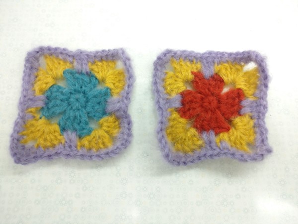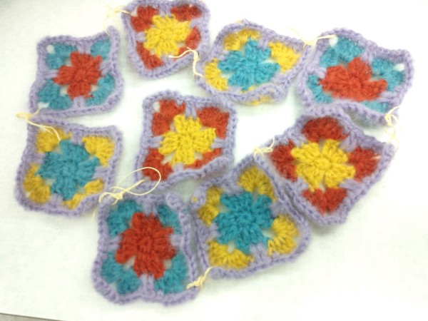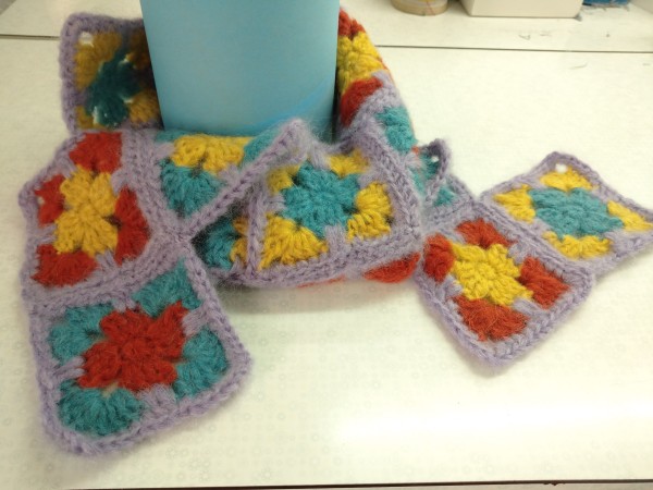 極細モヘアが色とりどりとありましたので、トーンを合わせて、4色選んで5本どりにして、ザクザクと四角形のモチーフを編み、ジグザグと繋ぎながらマフラーを作ってみました!