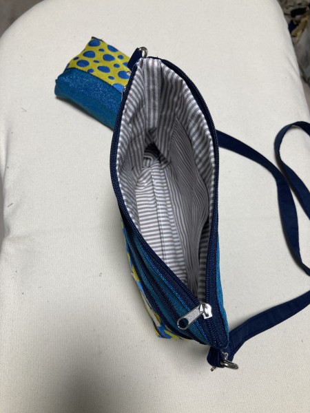 前面にダブルファスナーポケットあり。裏地つき。内側にもポケットあり。