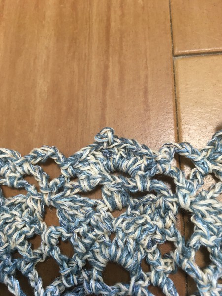薄黄色、ブルーグリーン、水色のラメ入り糸の3本どりで編みました