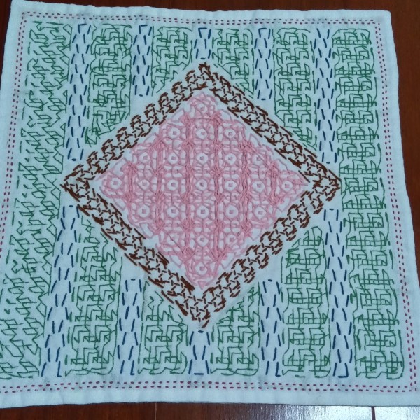 | オリムパスさんの花ふきん −La bouquetiere− Sakura を刺しました。 残り糸を使いたかったので、いろんな柄のある図案のものを選びました。おかげで、とてもカラフルになりました。 ただ、外枠の赤糸は、別の色にすれば良かったなと、ちょっと後悔が…。でもやり直す気力はないので、このまま使おうと思います。 |
